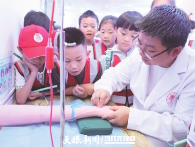 在贵阳康职大的谯老师专业引领下,小记者们学习了人体八大系统的知识,了解了血管的分布情况,通过显微镜观察了真实的人体切片。他们还通过显微镜,一探人体各组织细胞的精细结构。谯老师还给大家讲解了静脉与动脉血管血液的差异,并现场传授了遇到动静脉破裂时的紧急处理技巧。