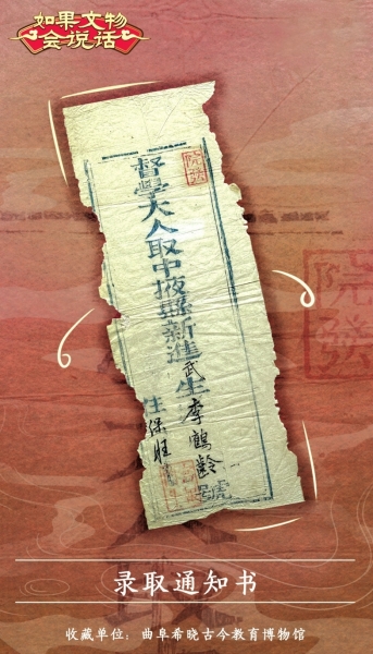| 山东督学发给掖县新生李鹤龄的录取通知书。 |