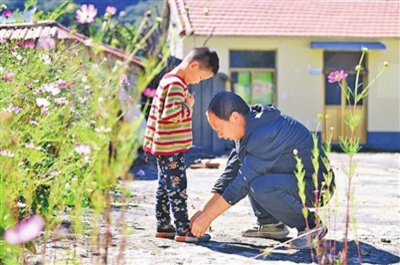 | 在山西马武寨寄宿制小学,校长赵金成(右)为幼儿秦望来系鞋带。新华社记者 杨晨光 摄 |