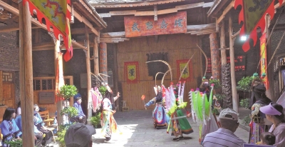 走进演武堂,馆长陈春伍热情欢迎了我们。看一场地戏,是到屯堡的必选项目。武戏文演,方寸之间千军万马走过,浓缩时空,正史演义道尽悲欢离合。演员们身着青、蓝、白、褐土布斜襟长衫,长裤,束青布腰带,穿布鞋,布扎靠旗,用两块绣有多种花边的布片将腰身围裹,象征战袍。手持木制刀、枪、剑、斧等十八般兵器,额戴面具,面蒙青纱,伴着铜锣、皮鼓等打击乐器,唱着“弋阳高腔”,为观众再现远古战争场面。地戏源于明代军傩,600年前,屯堡人从江南一带把军傩带到黔中,后经发展演变,吸收了本地少数民族民间戏剧的一些形式和内容。