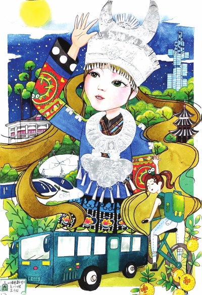 作品自述:贵州美丽的山水之间,孕育出独特的苗民族文化。华丽繁复的银饰,斑斓质朴的刺绣。这里的绿水青山就是金山银山。共同守护这个绿色家园,选择公共交通低碳出行,低碳出行是一种可持续的出行方式,与大自然和谐共处,持续享受绿色生活。