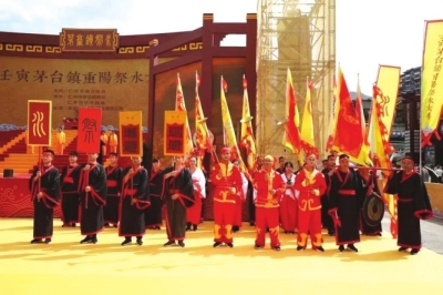 仁怀人有个独特的习俗——祭水。民间流传有“重阳下沙芳满缸,重阳酿酒香满江”的民谚,寓意重阳节是最适宜取水下沙酿酒的好时机,因此这天也就成了仁怀市祭水的日子。“祭水”仪式以茅台民风民俗为基本格调,继承了古老的祭祀文化,数千群众聚集在赤水河畔,以鲜花雅乐之仪,表达对自然、对祖先的感恩和敬仰,同时展示酒乡人民丰衣足食,幸福美满的情景。