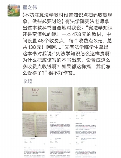 近日,华东政法大学教授、宪法学博士、博士生导师童之伟发朋友圈指出高等教育出版社《宪法学》教材中设置了46个二维码收费点,每个3元共138元,扫码付钱才能解锁新知识。