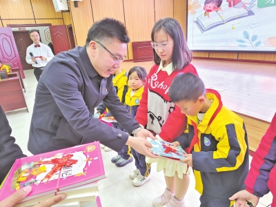 江口县委副书记、梵瑞社区驻村第一书记陈举国向学生赠书。 |