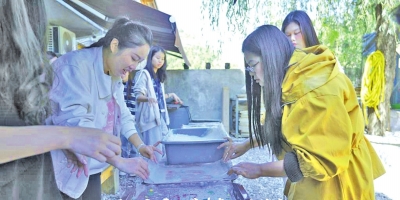 在“中国古法造纸之乡”丹寨石桥村,国际青年学生们学习了古法造纸技艺,用构皮麻作原料,添加滑药制作成白皮纸,放上花草,经过日晒,制作成了一张张花草纸。