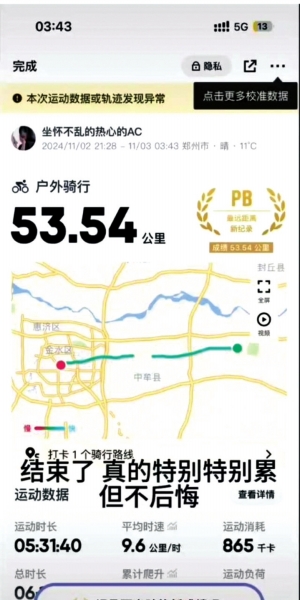 聊起这次夜骑郑州的原因,小付坦言,与郑州大学生夜骑开封有关:“我是11月2日中午刷到很多郑州大学生夜骑开封,感觉特别青春和自由,于是马上约上同学一起夜骑——既然他们能夜骑开封,我们也能从开封骑过去!”