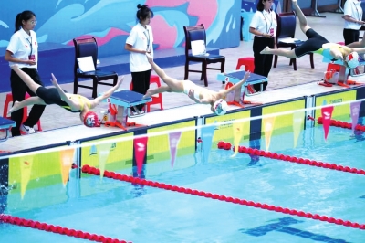 赛场上,气氛紧张而热烈。选手们身着专业的游泳装备,摩拳擦掌,跃跃欲试,随着比赛的进行,选手们在水中尽情展现自己的实力,在赛道内劈波斩浪,你追我赶,激起浪花朵朵,出色的发挥赢得现场观众掌声、呐喊声一片,现场气氛紧张而热烈。