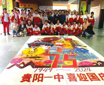 3天时间,32块白色画框在学生用心的描绘与细腻的笔触下被赋予绚丽的色彩,最终拼合成一幅高4.8米宽2.8米的巨幅绘画作品,勾勒出学生对祖国的热爱与敬仰。今年国庆,贵阳一中举办“同心共悟长征情”群体现场绘画活动,在学校美术组老师的指导下,2026届32个班级共64名同学共同创作,用自己的方式向祖国献上了一份特别的礼物。