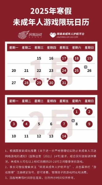 腾讯、网易发布未成年人寒假游戏限玩日历