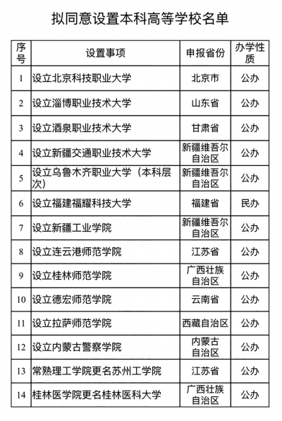 本次公示显示,根据 《中华人民共和国高等教育法》 《普通高等学校设置暂行条例》 《普通本科学校设置暂行规定》 《本科层次职业学校设置标准(试行)》等有关规定以及第八届全国高等学校设置评议委员会考察评议结果,经教育部党组会议审议,拟同意设置北京科技职业大学等14所学校。