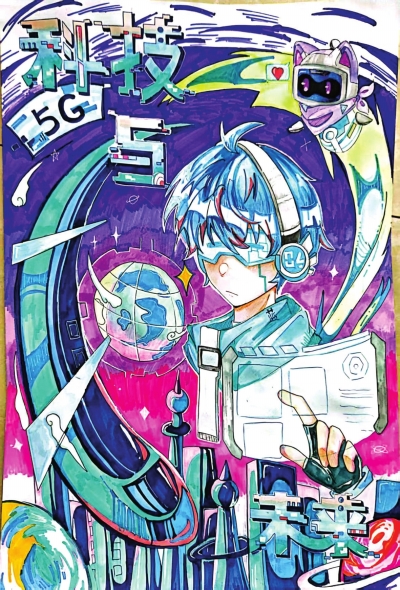这幅画作宛如一扇通往未来的窗口。头戴耳机、护目镜的少年,于“5G”标识下,凝视地球。机械萌猫相伴,未来都市林立,尽显科技梦幻魅力。