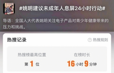 全国两会期间,全国人大代表姚明建议,未成年人开展“息屏24小时”行动,引发网友关注。