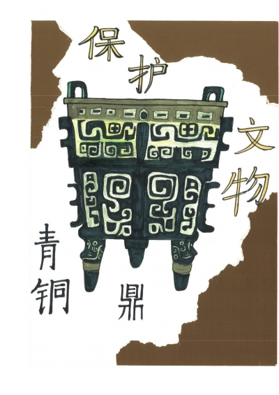 点评:作品布局简洁明了,青铜鼎居于画面中心,成为视觉焦点,四周的文字布置疏密得当:背景采用撕裂纸张效果,增添古朴、沧桑氛围;色彩运用上,主体青铜鼎以深沉的青绿色搭配古朴纹饰,体现其年代感与质感;背景的棕色与主体青铜鼎的绿色对比强烈,使主体更突出。
