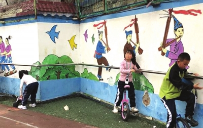 | 新州二小的围墙上安装了扶手,供孩子们自学独轮车。 |