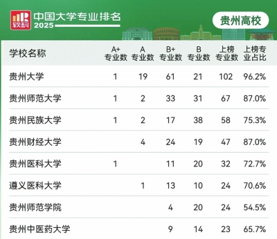在2025软科中国大学专业排名中,贵州共有25所高校的527个专业上榜。其中,A+专业数4个,A专业数28个,B+专业数197个,B专业数298个。
