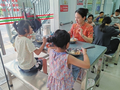 | 邓小凤(右)陪同孩子用餐。 |