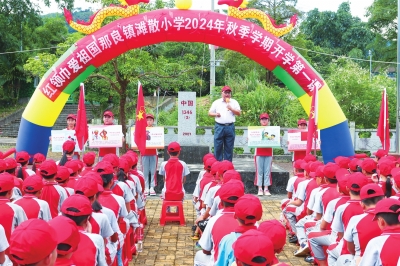 滩散小学背靠十万大山,距离越南仅一河之隔,直线距离300米,蜿蜒的界河从学校旁边而过。守护界碑是这个学校坚持了20多年的特殊传统,每年,都要在这里举行少先队员的入队仪式,爱疆、护疆、守疆的意识早已深入孩子们的心里。