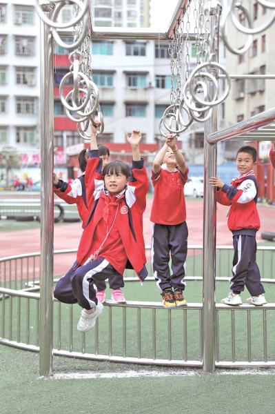 下课铃声响起后,孩子们涌出教室,打篮球、攀岩、玩吊环、荡秋千、骑独轮车……玩得不亦乐乎,欢声笑语在校园里回荡。