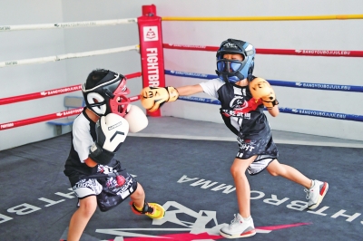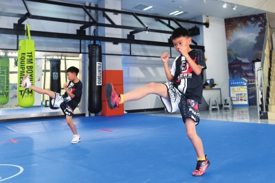 | 7月13日,仁怀市体育馆内,小朋友在练习散打。 |
