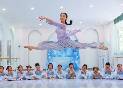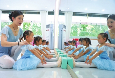 | 7月13日,在开阳县一家舞蹈培训机构,孩子们在舞蹈老师的带领下练习舞蹈动作。 |