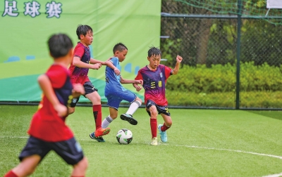 | 7月12日,在铜仁市玉屏侗族自治县全民健身中心,小球员在足球比赛中拼抢。 |