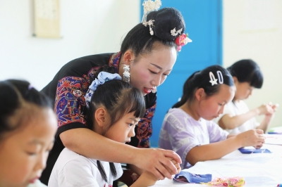 | 7月12日,在施秉县文化馆,非遗传承人指导小朋友苗族刺绣技巧。 |