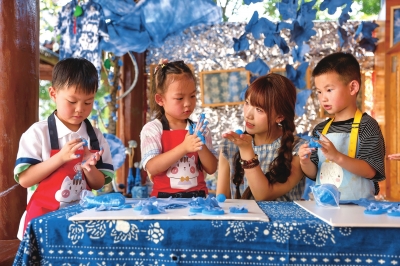 | 黔东南施秉县第四幼儿园,老师在指导学生体验苗族扎染。磨桂宾 摄(贵州图片库发) |