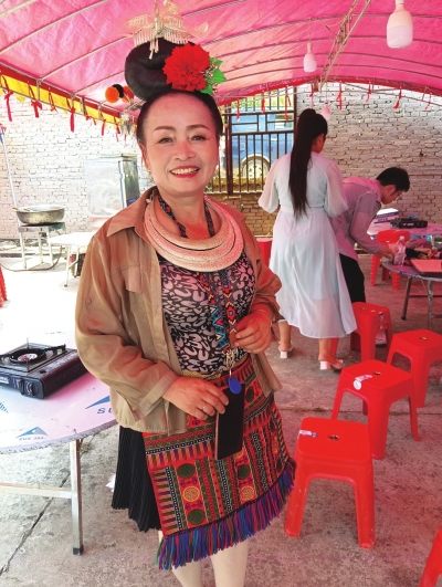 | 王兴秀向调研组展示自己设计的苗绣服饰。 |