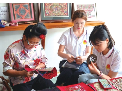 | 实践团成员向李玉芳老师学习刺绣。 |