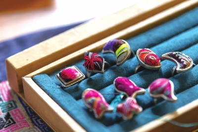 | 孩子们展示自己制作的侗族刺绣戒指。 |