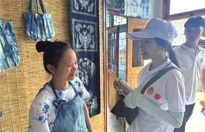 实践第二日,团队沉浸于传统工艺体验。在“布依族扎染手工艺体验工坊”,传承人取出纯天然植物熬制的染料,演示了“捆扎如星、浸染成纹”的传统技法。团队成员尝试捆扎棉布、浸入染缸,看着白坯布晕染出山间云雾般的蓝白纹样,真切感受到“取材自然、回归本真”的民族智慧。