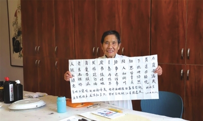 | 欧秋芳老人展示自己的书法作品。 |