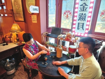 “在最美的年华遇见你,是我们前世种下的花朵。你为我花开,我为你花落……”夏日的贵州,推开窗便是满眼绿意,凉风习习。在贵阳市南明区青云市集,有一家名为“十元茶馆”的店铺,茶香氤氲。店老板陈姣正熟练地冲泡着一壶翠色欲滴的“绿宝石”茶,她的丈夫曹洋在旁热情地招呼着前来喝茶的客人。