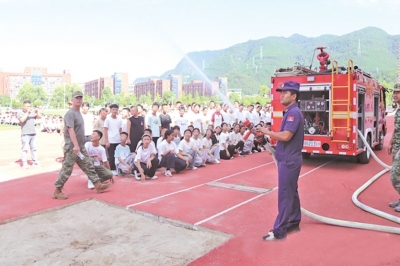 8月27日,绥阳县消防大队联合县教体局借助高一、初一新生军训,开展消防安全知识培训,用形式多样的理论知识学习和实地灭火器油池灭火体验、逃生疏散演练,让绥阳中学全体新生体验不一样开学典礼。