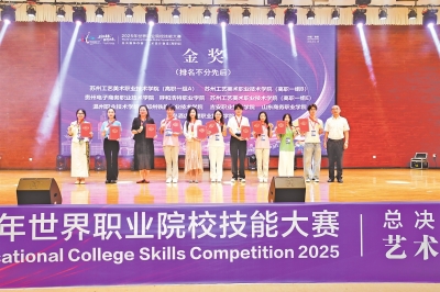 8月31日,以“技炫青春能创未来”为主题的2025年世界职业院校技能大赛总决赛争夺赛艺术设计赛道(高职组)在贵阳清镇圆满落幕。经过数日激烈角逐,苏州工艺美术职业技术学院(高职一组A、B)、贵州电子商务职业技术学院等20支参赛队摘得金奖,德州职业技术学院、湖北国土资源职业学院、湖南大众传媒职业技术学院(高职一组B)等37支队伍荣获银奖,安徽职业技术大学、河南机电职业学院、贵州建设职业技术学院等57支队伍收获铜奖。