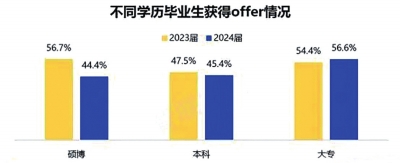 智联招聘2024年发布的 《大学生就业力调研报告》 显示,大专学历应届毕业生获得offer的比率最高,占比56.6%,且高于前一年的54.4%。本科、硕博学历应届毕业生的offer获得率分别为45.4%、44.4%,均低于前一年。报告认为,大专学历毕业生拥有技能优势,并对自身的学历差距有比较清晰的认知,因而会合理调整就业预期,offer进展更顺利。
