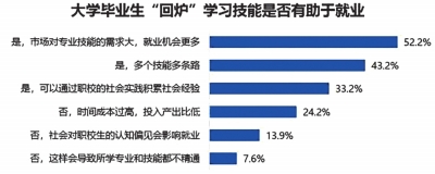 该报告公布的数据显示,大学生“回炉”职校学技能广受认可,超半数认为将增加就业机会。