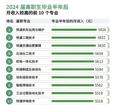 在2024届高职专业月收入TOP10排行榜中,铁道类专业就占据了5席 (铁道机车5926元、铁道工程技术5832元、铁道交通运营管理5820元、动车组检修技术5578元、铁道供电技术5518元)。