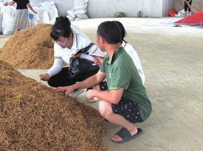 乔姗姗 (左一) 查看烘干的太子参。 |