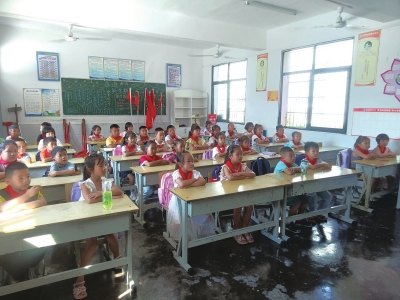 在松桃苗族自治县妙隘乡完小的校园里,各班班主任组织学生们在教室里,全神贯注地收看阅兵。与此同时,其他教师则齐聚该校的国学经典诵读室,共同见证这一盛大时刻。