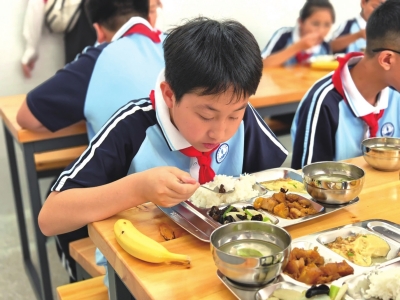 记者看到,该校首日午餐包括土豆红烧肉、山药木耳、肉末蒸蛋和丝瓜肉片汤,并配有香蕉一份。餐盘中的菜品色泽诱人、搭配均衡。