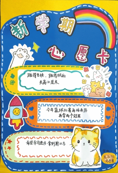 这些心愿,有的与学习成绩相关,有的指向兴趣特长,还有的关乎人际交往与自我成长。从“各科成绩提高”到“学会打篮球”,从“老师小帮手”到“未来梦想”,不同年级的孩子们给出了各具特色的答案。每一张“心愿卡”,都闪烁着青春的光芒,记录着孩子们对新学期的憧憬与努力的起点。小学生的心愿直白可爱,初中生更注重成绩与兴趣的平衡。
