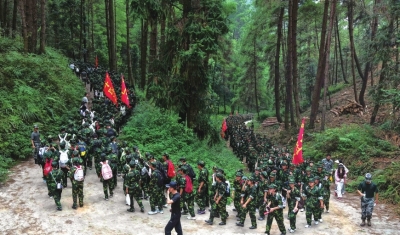 上午7点半,新生军训团在训练场集合后从学校西大门出发,经惠水县濛江实验小学、城北新区,沿婧发纸厂河边路段,最终抵达野梅岭森林公园长坡目的地,单程7.5公里,往返共15公里,历时5小时。