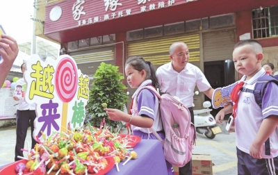 | 古州二小孩子们入校前领取老师准备的棒棒糖。 |