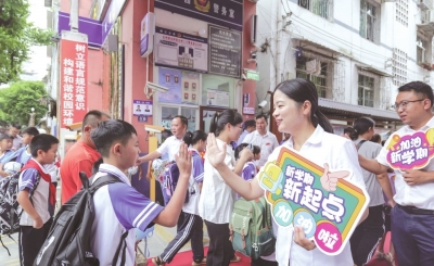 | 校长杨贤泽站在门侧与入校的孩子击掌。 |