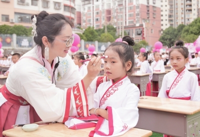 朱砂启智环节,老师用毛笔蘸取朱砂,在学生额头正中轻点红痣,寓意开启智慧,祝愿孩子们耳聪目明、心灵手巧,好读书、读好书。鲜红的朱砂痣承载着师长期许,也点亮了孩子们对学习生活的憧憬。