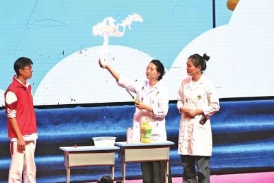 上午10时,在毕节市民族中学的足球场上,学校组织高一年级学生整齐排列,有序观看航模、车模等表演,同时在专业人员的引导下了解相关科技知识,体验着实操的乐趣。与此同时,在学校演播厅内,科普短剧 《校园反诈》,科普实验《马德堡半球科普实验》《液氮乒乓球》等科普表演节目轮番登场,引得现场观看的七八年级学生连连惊叹。