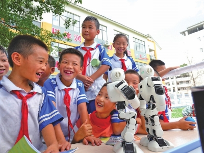 | ←榕江县古州镇第二小学学生近距离认识智能机器人。 |
