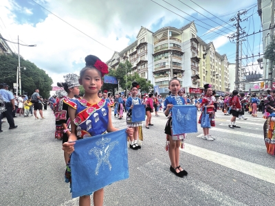 “让孩子们从小接触、学习非遗,不仅是技能传授,更是文化根脉的延续。”带队参加游行的丹寨县第二小学老师曾征告诉记者,三年前学校开始组建相关的非遗社团,将非遗项目引入课后服务和兴趣课堂,孩子们非常喜欢,家长也很支持。当天孩子们参加巡演时,不仅穿上了所属苗族支系特有的民族服饰,手中所拿的蜡染作品也都是自己亲手制作的。