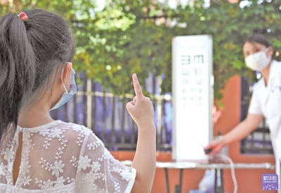 河北省邯郸市丛台区联新里社区的小朋友在接受视力检测。新华社发 郝群英 摄 |